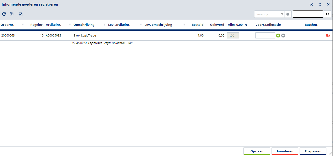 In het onderstaande voorbeeld hoeft alleen nog de voorraadlocatie gevuld te worden, en vervolgens kan er op opslaan gedrukt worden. Dan is de inkooporder definitief binnengemeld.