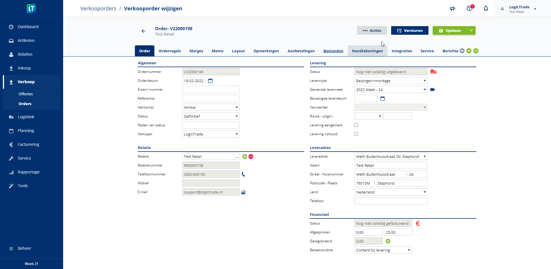 Je kan in LogicTrade de verkooporder versturen door op de 'Versturen' knop te klikken. Na het selecteren van de verzendwijze wordt de verkooporder naar de klant verstuurt. Deze 'Versturen' knop is nu ook toegevoegd bij de facturen. Voor deze update ging je naar acties --> afdrukken om de factuur te versturen. Nu kan je hier de 'Versturen' knop voor gebruiken.